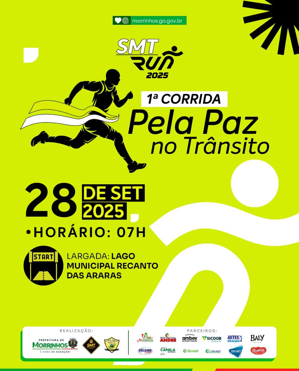 No próximo domingo, 28 de setembro, o Lago Municipal Recanto das Araras será palco da 1ª edição da SMT RUN, evento esportivo promovido pela Prefeitura de Morrinhos, por meio da Superintendência Municipal de Trânsito (SMT).